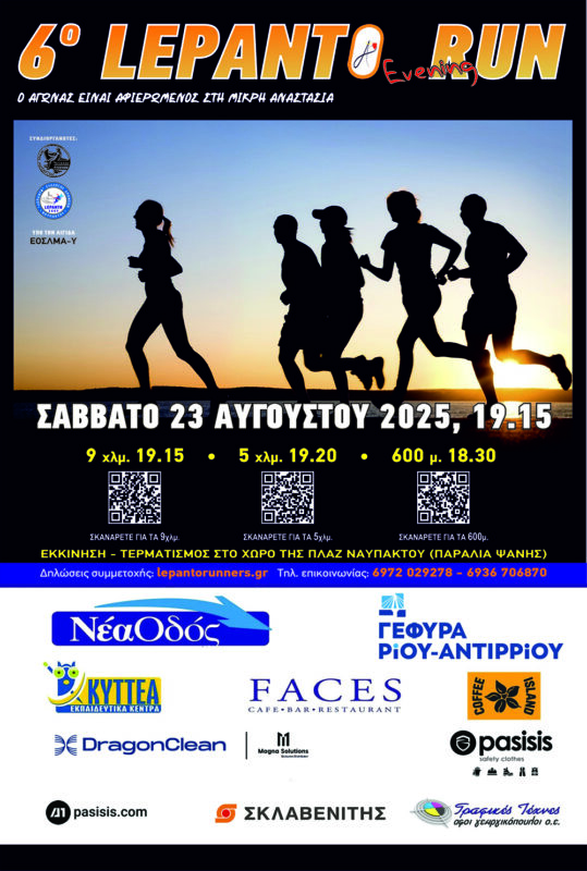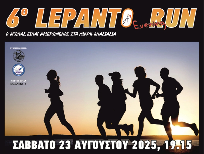 Ο Σύλλογος «lepantorunners» διοργανώνει τον 6ο Lepanto Evening Run, μια μοναδική δρομική εμπειρία στο παραλιακό μέτωπο της Ναυπάκτου, γεμάτη ενέργεια, χαρά και αθλητικό πνεύμα.