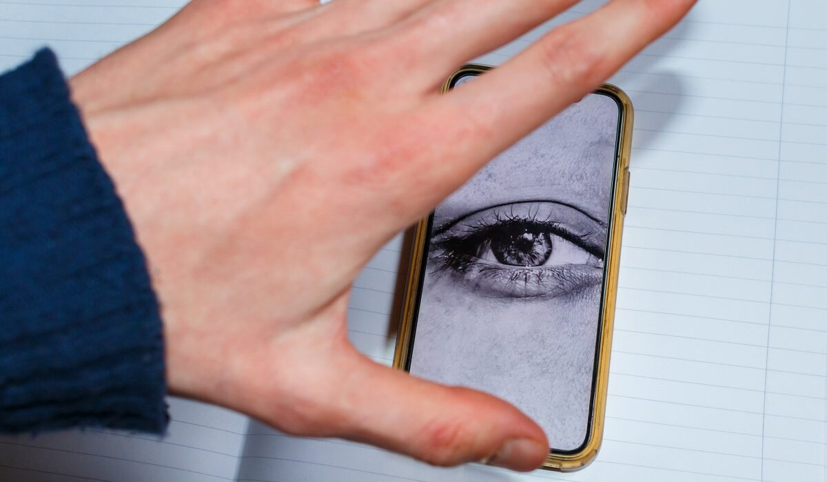 Big,Eye,On,The,Smartphone,Screen,Watches,Its,User.,Hand