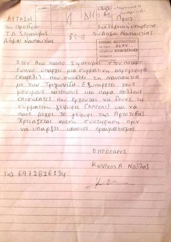 Με επιστολή του ο τότε πρόεδρος ΤΚ Στράνωμας Κ. Νούλας ενημερώνει τον Δήμο ότι υπάρχει πρόβλημα.