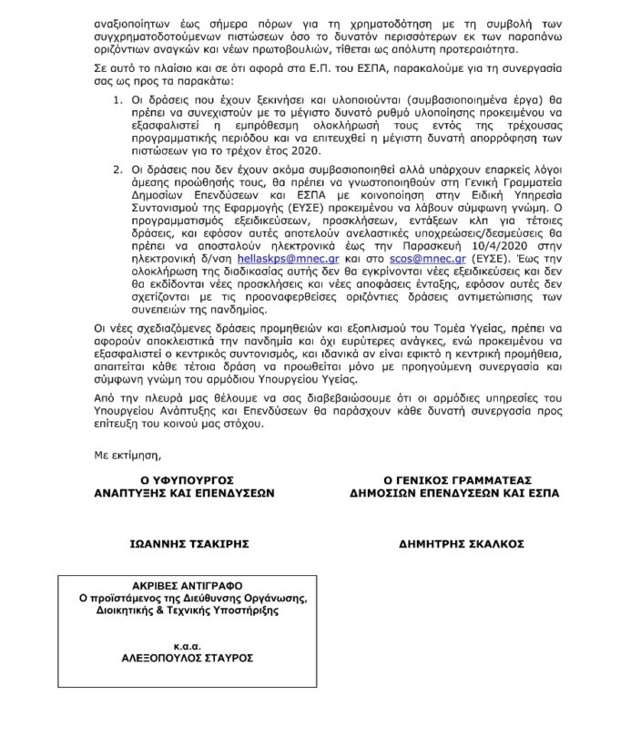 Όσον αφορά πάντως τα συμβασιοποιημένα έργα, τονίζεται πως θα πρέπει να συνεχιστούν με το μέγιστο δυνατό ρυθμό υλοποίησης, προκειμένου να εξασφαλιστεί η εμπρόθεσμη ολοκλήρωσή τους εντός της τρέχουσας προγραμματικής περιόδου και να επιτευχθεί η μέγιστη δυνατή απορρόφηση των πιστώσεων για το 2020.