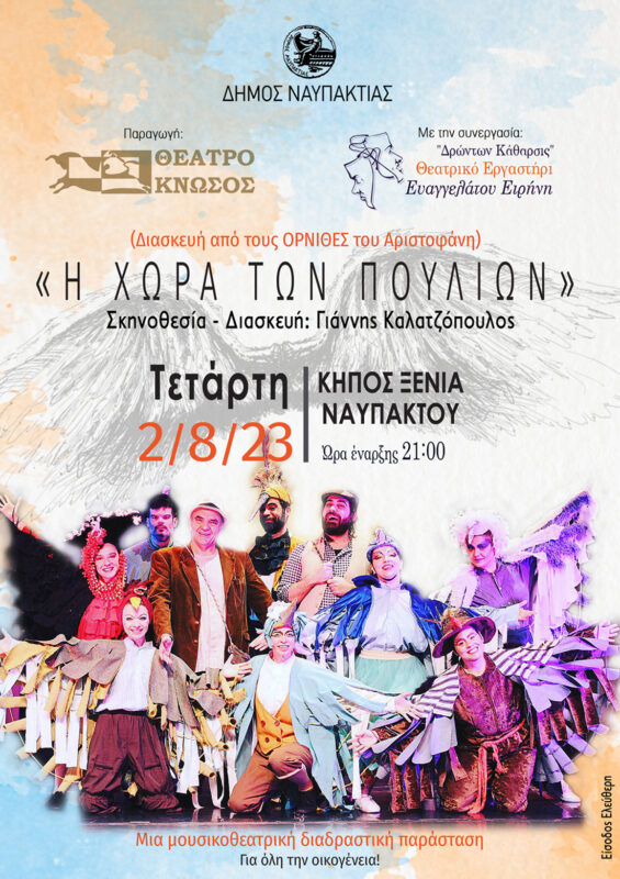 Ο Δήμος Ναυπακτίας σε συνεργασία με το Θεατρικό Εργαστήρι της Ειρήνης Ευαγγελάτου «Δρώντων Κάθαρσις» παρουσιάζουν την Τετάρτη, 2 Αυγούστου 2023 και ώρα 21:00′, στον Κήπο του «Ξενία», τη θεατρική παράσταση «Η ΧΩΡΑ ΤΩΝ ΠΟΥΛΙΩΝ», σε παραγωγή του Θεάτρου Κνωσός και διασκευή-σκηνοθεσία του Γιάννη Καλατζόπουλου.