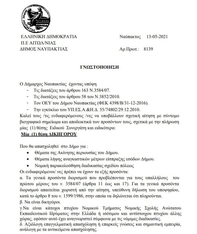 Ο Δήμαρχος Ναυπακτίας, σύμφωνα με την ανάρτηση στο «Διαύγεια» στις 13-05-2021 και με Αρ.Πρωτ.: 8139, καλεί τους /τις ενδιαφερόμενους /νες να υποβάλλουν σχετική αίτηση με σύντομο βιογραφικό σημείωμα και αποδεικτικά των προσόντων τους, σχετικά με την πλήρωση μίας θέσης Ειδικού Συνεργάτη και ειδικότερα: Μία θέση Δικηγόρου.