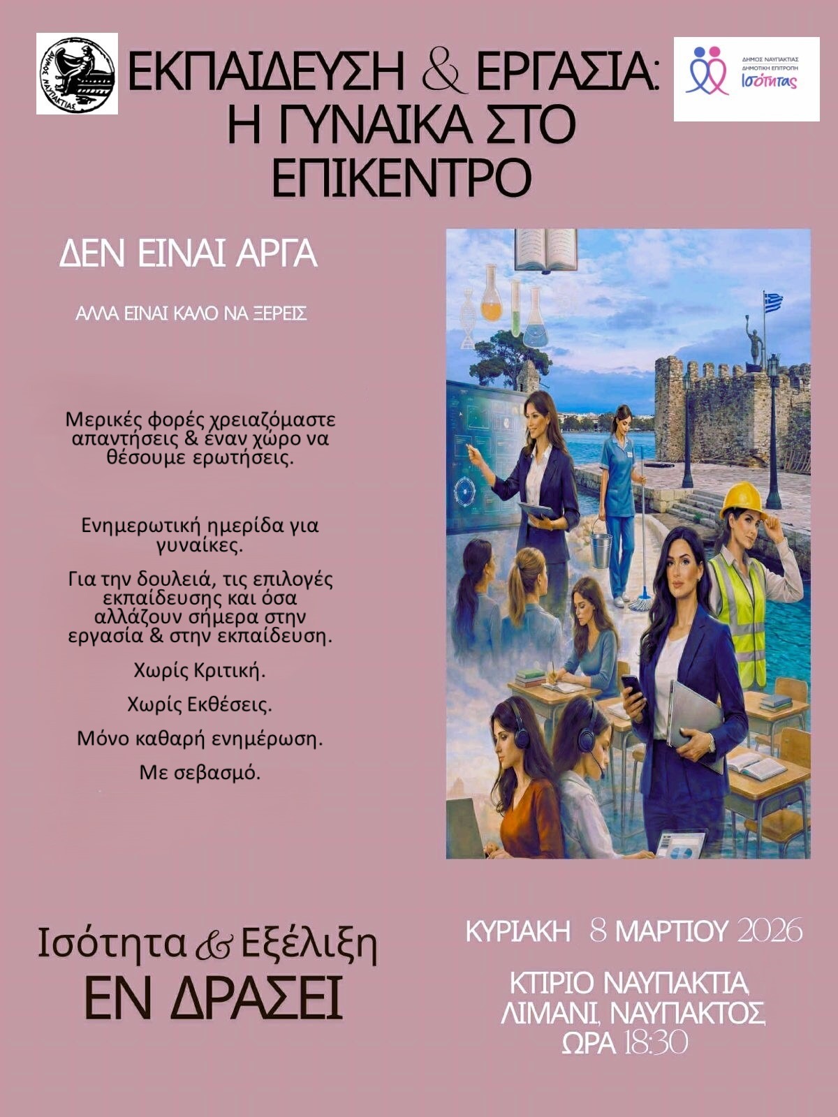 Ο Δήμος Ναυπακτίας και η Επιτροπή Ισότητας Δήμου Ναυπακτίας, τιμούν την Ημέρα της Γυναίκας, διοργανώνοντας την ημερίδα «Εκπαίδευση και Εργασία: Η γυναίκα στο Επίκεντρο» την Κυριακή, 8 Μαρτίου, στο κτήριο «Ναυπακτία» (Λιμάνι Ναυπάκτου), στις 18:30′. Στόχος είναι η ενημέρωση γύρω από τις σύγχρονες απαιτήσεις της αγοράς εργασίας, τις διαθέσιμες δυνατότητες εκπαίδευσης και κατάρτισης, καθώς και τις προοπτικές επαγγελματικής εξέλιξης των γυναικών.