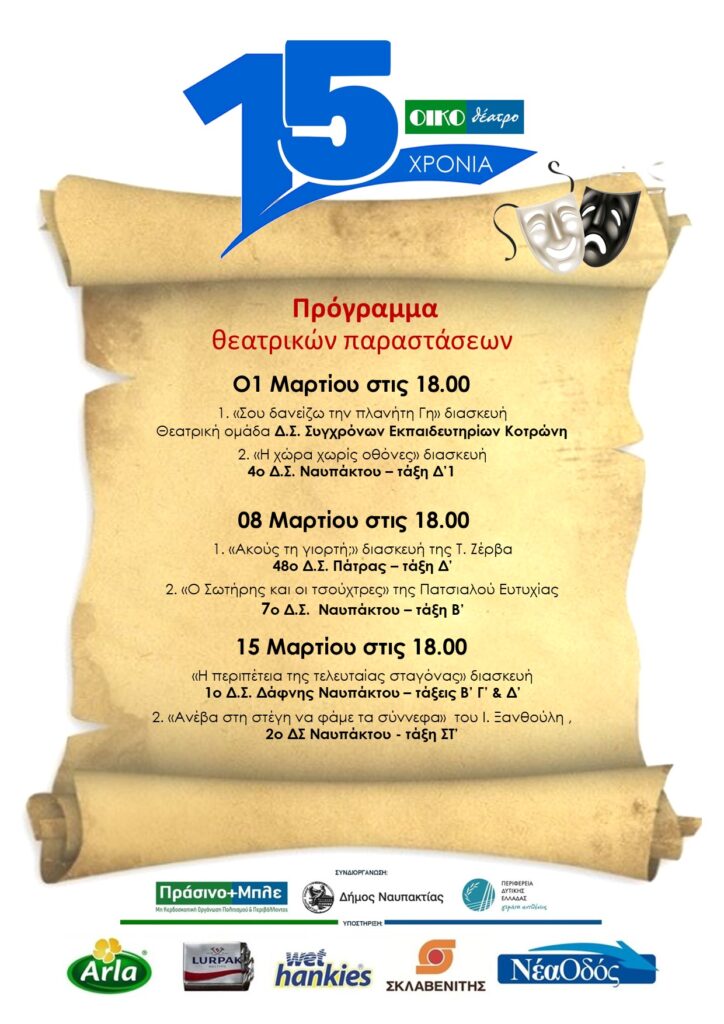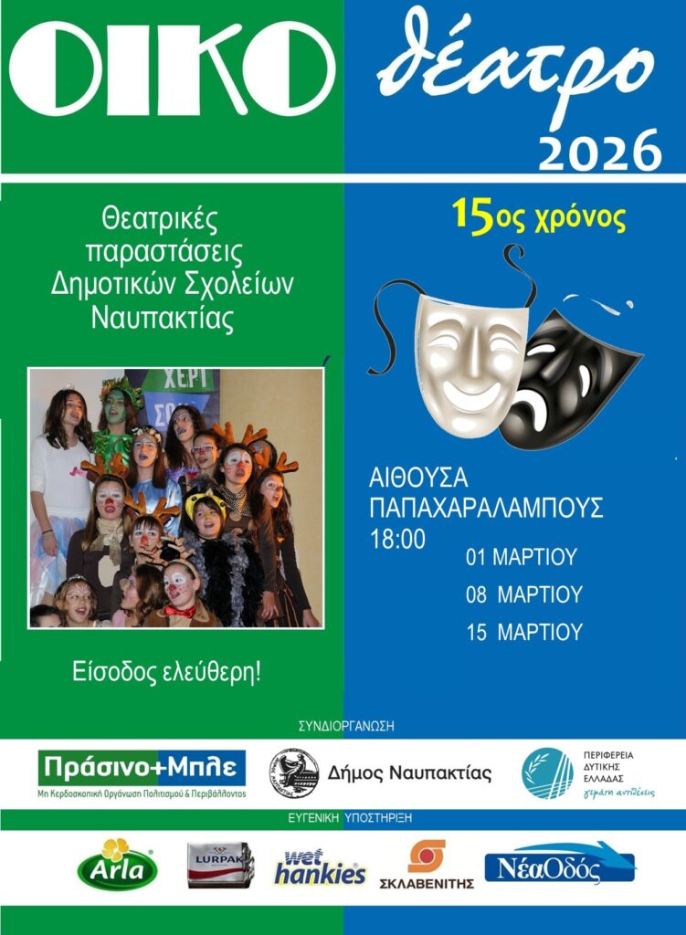 Την Κυριακή 15 Μαρτίου και ώρα 18.00 ολοκληρώνεται η δράση «ΟΙΚΟθέατρο» με τις δύο τελευταίες θεατρικές παραστάσεις στην Παπαχαραλάμπειο αίθουσα Ναυπάκτου, από τα δημοτικά σχολεία, Δάφνης και 2ο Ναυπάκτου.