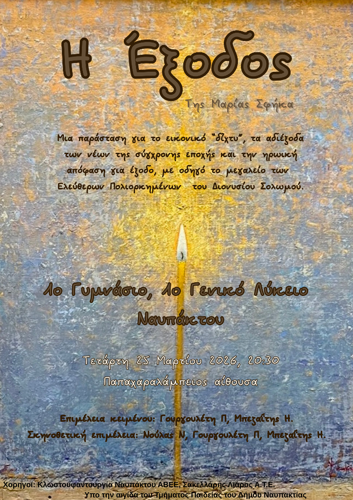 Το 1ο Γυμνάσιο και το 1ο Γενικό Λύκειο Ναυπάκτου παρουσιάζουν την Τετάρτη 25 Μαρτίου στις 20:30 στην Παπαχαραλάμπειο αίθουσα εκδηλώσεων την παράσταση «Η Έξοδος».