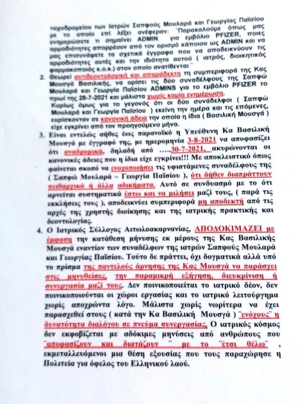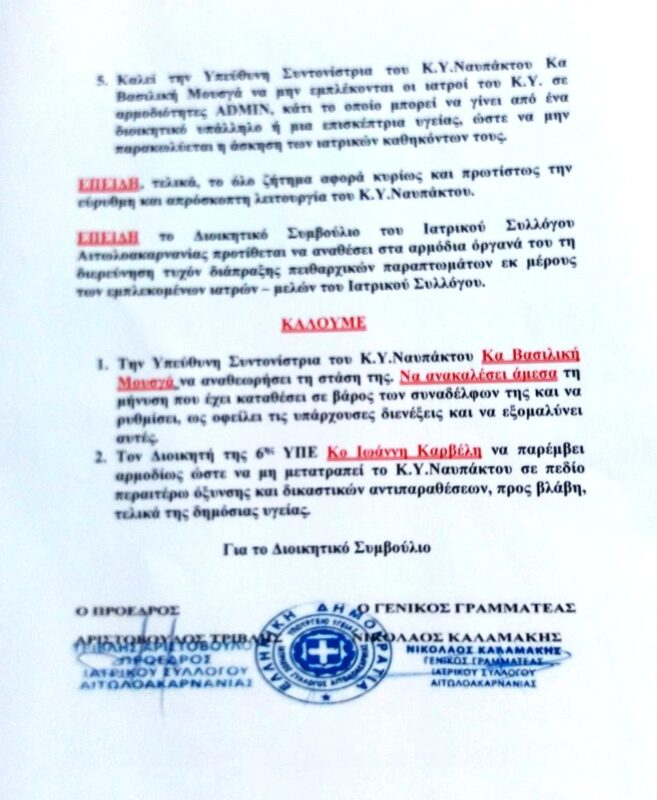 Λάβρος κατά της διοίκησης του Κέντρου Υγείας Ναυπάκτου ήταν με έγγραφό του ο Ιατρικός Σύλλογος Αιτωλοακαρνανίας, ο οποίος έδωσε βροντερό παρών στη διαμάχη που έχει ξεκινήσει η διεύθυνση του Κέντρου Υγείας εναντίον των ιατρών. Συγκεκριμένα χαρακτηρίζει αήθη και αντιδεοντολογική τη συμπεριφορά της διευθύντριας να ορίσει υπηρεσιακά καθήκοντα σε ιατρούς ενώ βρίσκονται σε κανονική άδεια, αήθες εως και παρανοϊκό το έγγραφό της 3-8-21 να ακυρώνει αναδρομικά από 30/7/21 τις κανονικές τους άδειες με αποκλειστικό σκοπό να τους ενοχοποιήσει ότι δήθεν διαπράττουν πειθαρχικά αδικήματα, ανεπίτρεπτο το να μην τύχει απάντησης email με το οποίο οι ιατροί ρωτούσαν λεπτομέρειες και οδηγίες σχετικά με τα καθήκοντα που τους ανατίθενται και αποδοκιμάζει με έμφαση την κατάθεση μήνυσης εις βάρος των ιατρών υπό το πρίσμα της παντελούς άρνησης της διευθύντριας να παράσχει στους ιατρούς οποιαδήποτε εξήγηση ή συνεργασία. Τέλος καλεί την διευθύντρια να ανακαλέσει άμεσα τις μηνύσεις και τον Διοικητή της 6ης ΥΠΕ κ Καρβέλη να παρέμβει ώστε να κατευνάσει τα πνεύματα.