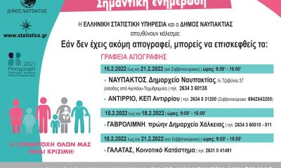 Ο Δήμος Ναυπακτίας σε συνεργασία με την Ελληνική Στατιστική Υπηρεσία από σήμερα Τρίτη, 15 Φεβρουαρίου 2022 θέτουν σε λειτουργία κατά τόπους ΓΡΑΦΕΙΑ ΑΠΟΓΡΑΦΗΣ για τη διευκόλυνση των πολιτών...