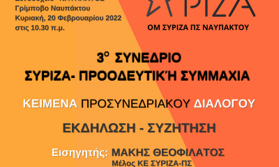 Η ΟΜ ΣΥΡΙΖΑ – ΠΣ Ναυπάκτου διοργανώνει εκδήλωση – συζήτηση εν όψη του 3ου Συνεδρίου του ΣΥΡΙΖΑ – ΠΡΟΟΔΕΥΤΙΚΉ ΣΥΜΜΑΧΙΑ. Η εκδήλωση θα πραγματοποιηθεί την Κυριακή...